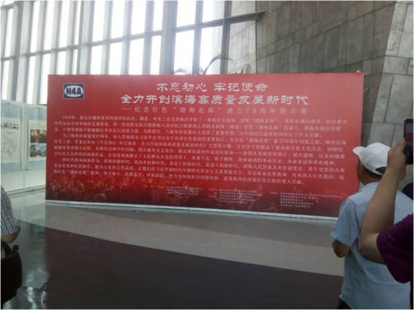 在炎炎烈日下,郝爱明一行首先赶赴滨海城市艺术馆参观红色文化图片展。