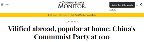 文章标题为《中国共产党迎来百年华诞:在国外受到诋毁,在国内广受欢迎》,直接反映了长期以来抱着偏见报道中国的部分西方媒体的“困惑”:为何中国民众对中国政府的满意度连年超过90%。